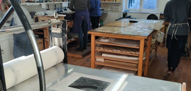 La Maison de l’Estampe des Grands Moulins à Gleizé La gravure est un art ancestral qui incarne à la fois tradition, précision et créativité. Des gestes précis, une technique minutieuse, un travail patient et passionné, comme nous le confie Mireï Locatelli-Revy et Gladys Brégeon, toutes deux membres de l’Atelier Alma.
