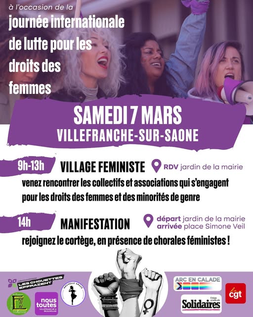 En solidarité avec les femmes du monde entier ce samedi 7 mars 2026 à Villefranche-sur-Saône, de 9H-13h Village féministe Jardin Sud Hôtel de Ville et 14h manifestation place Simone Veil quartier Monplaisir